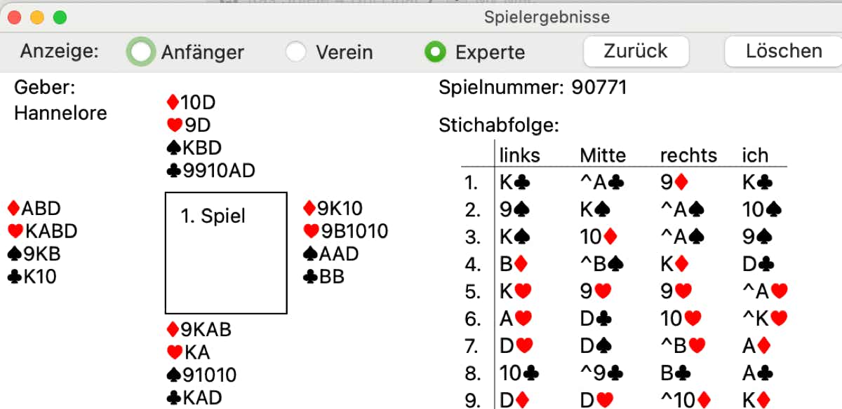 Die Ergebnisliste wurde um viele neue Informationen erweitert. Beispielsweise die Kartenverteilung, die einzelnen Stiche und vieles mehr können Sie sich anzeigen lassen. Es gibt jetzt einen Anfänger-,Verein- und Expert-Mode