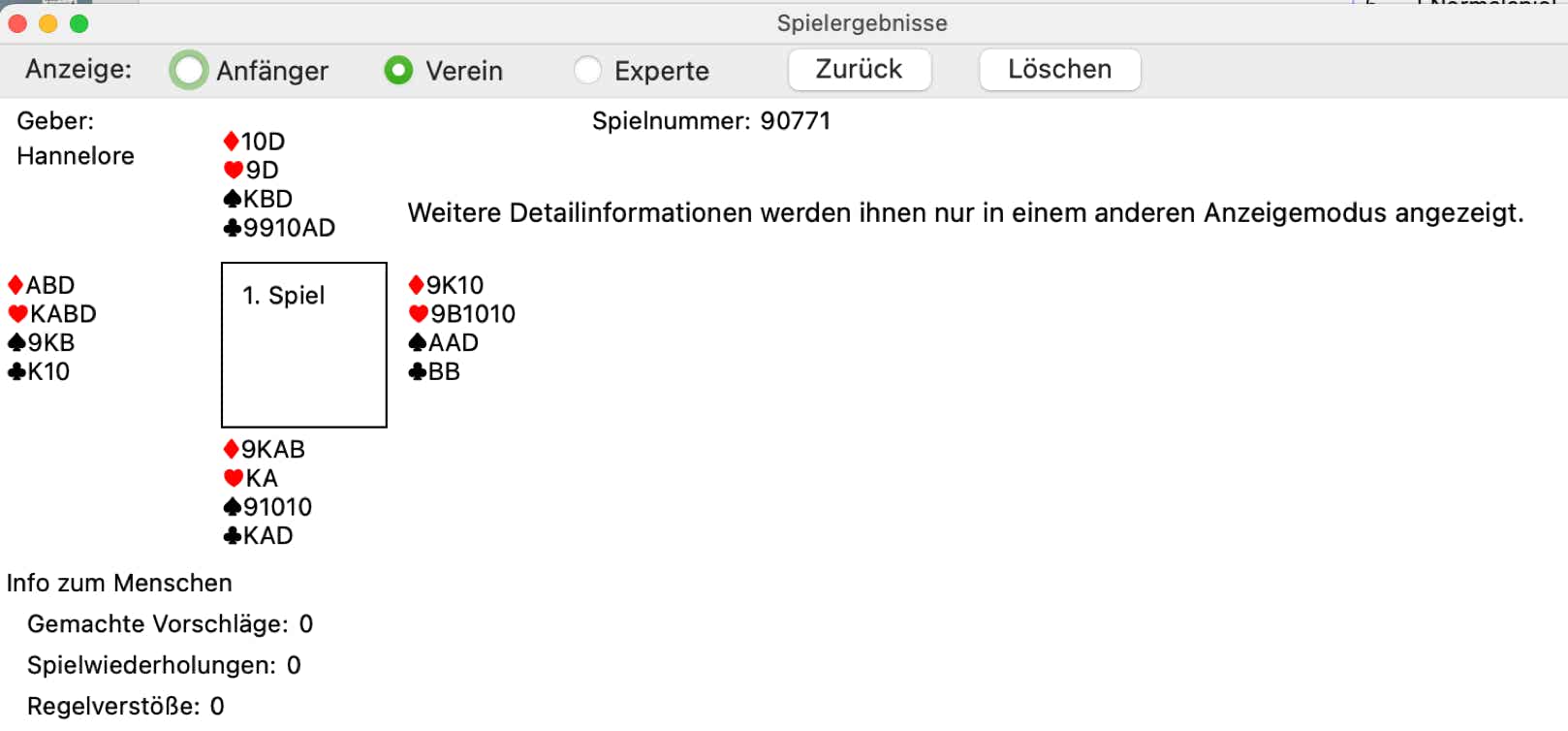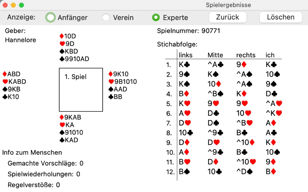 Dieses Beispiel habe ich dem Doppelkopfspiel entnommen. In ähnlicher Weise erfolgt die Anzeige für Skat, Schafkopf und dem neuen Spiel Bridge. Ganz wichtig ist an dieser Stelle die oben aufgeführten Spielnummer. In unserem Beispiel ist es die 90771. Wenn sie uns einen Fehler melden, dann schicken Sie uns einfach einer Email mit folgenden Angaben: