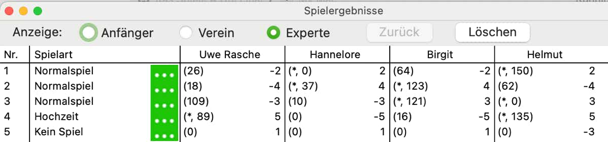 Die Ergebnisliste wurde um viele neue Informationen erweitert. Beispielsweise die Kartenverteilung, die einzelnen Stiche und vieles mehr können Sie sich anzeigen lassen. Es gibt jetzt einen Anfänger-,Verein- und Expert-Mode